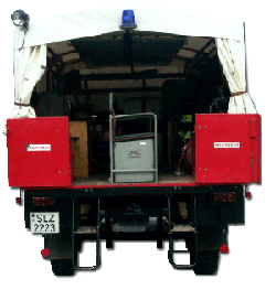 Löschgruppenfahrzeug LF 8- TS 8Bei diesem Fahrzeug handelt es sich um ein Löschgruppenfahrzeug (LF 8). Eine Löschgruppe besteht aus einem Gruppenführer sowie acht Mannschaftsmitglieder. Das LF 8 verfügt über eine fest eingebaute Frontpumpe sowie eine eingeschobene Tragkraftspritze TS 8/8. Zur weiteren Beladung gehört die DIN- Ausstattung für eine Löschgruppe sowie ein Stromgenerator mit Beleuchtungssatz.